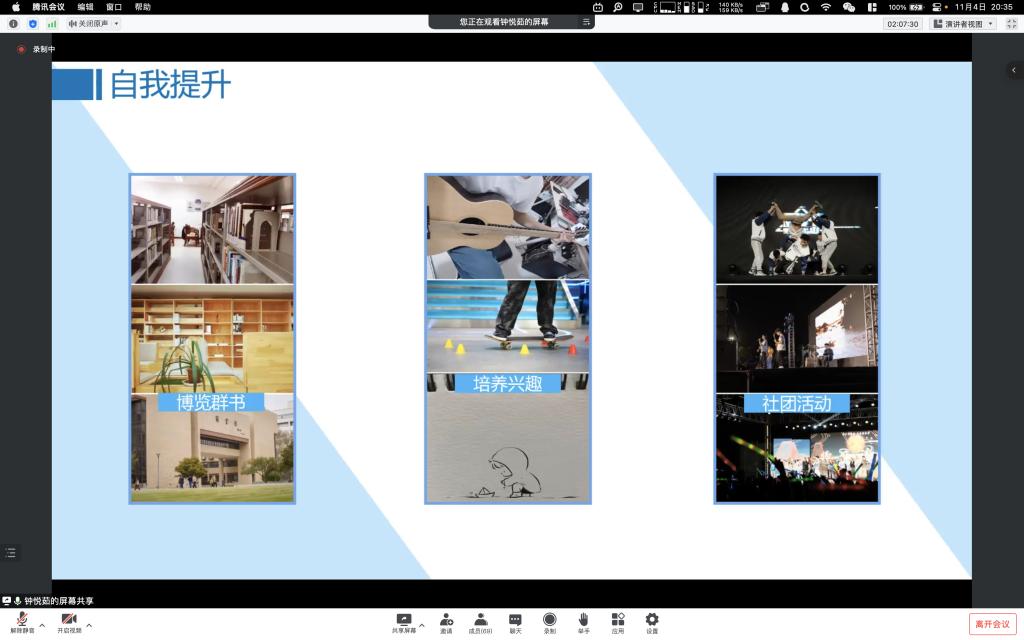 接下来是20级本科生尹紫嫣的大学学习生活经验分享。她从学习、工作和生活三个方面对大学生活进行了深度的剖析和理解。侧重于本科时期的学习方面,提出应明确学习目标、规范学习方法和学习计划、增强主动学习的能力等。