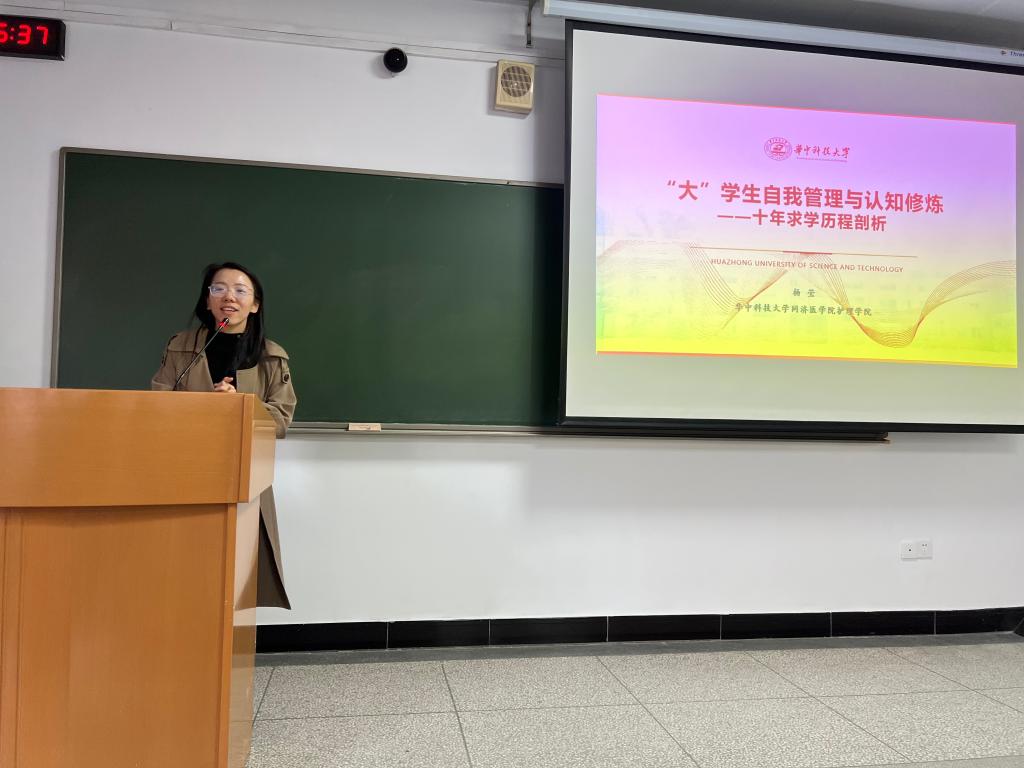 会议伊始,杨莹老师以“大学生自我管理与认知修炼”为主题,通过“十二年求学历程剖析”,立足自身,将个人经验倾囊相授。杨莹老师是原beat365英国官方网站beat365英国官方网站护理学(四年制)1101班毕业生,她从“个人学习经历、自我管理、专业认知”三个方面展开,为与会嘉宾带来了一场丰富翔实的演讲。