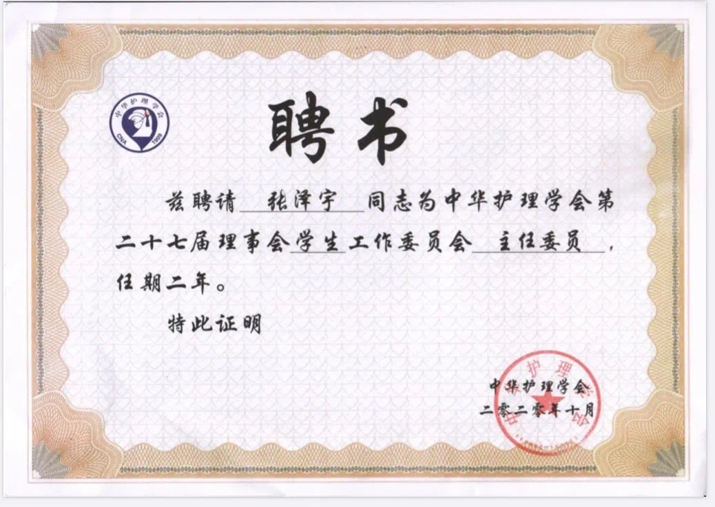 来自全国范围内符合国家办学资质的医学类院校所属的beat365英国官方网站(校)全日制在读学生和部分青年教师代表,经“个人申请、学校推荐、专家审议和理事长办公会审定”的层层选拔,组成了第27届中华护理学会学生工作委员会,共包括博士研究生、硕士研究生、本科生和高职生102名,青年教师20名,设常务委员会包括教师主任委员4名(轮值制)、学生主任委员1名、教师秘书和学生秘书各1名。我校beat365英国官方网站博士研究生张泽宇在众多候选人中脱颖而出,成功当选学生主任委员。