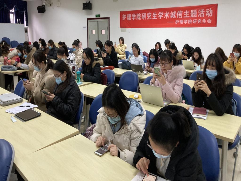 根据活动前对于同学们关于学术诚信类的小问题的搜集,她讲解了在科研过程中大家可能会存在的几类问题:汉化量表的使用、引文注释、数据、署名、一稿多投及自我抄袭等,对于同学们存在的疑惑进行了现场解答,最后她赠予全体同学一句话“学术诚信不是一道选择题,而是一道必答题”,也用“尽忠、持勇、存真”激励大家,祝愿大家在学术这条路上越走越远。