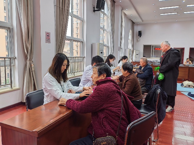 到达龙湖社区后,团队成员与社区工作人员汇合完成活动现场布置,随后为络绎不绝前来的社区老人开展“爱心义诊”,完成血压测量及一对一健康知识宣教,为前来义诊的老人答疑解惑,帮助社区老人们更好地理解了自己的健康状况。