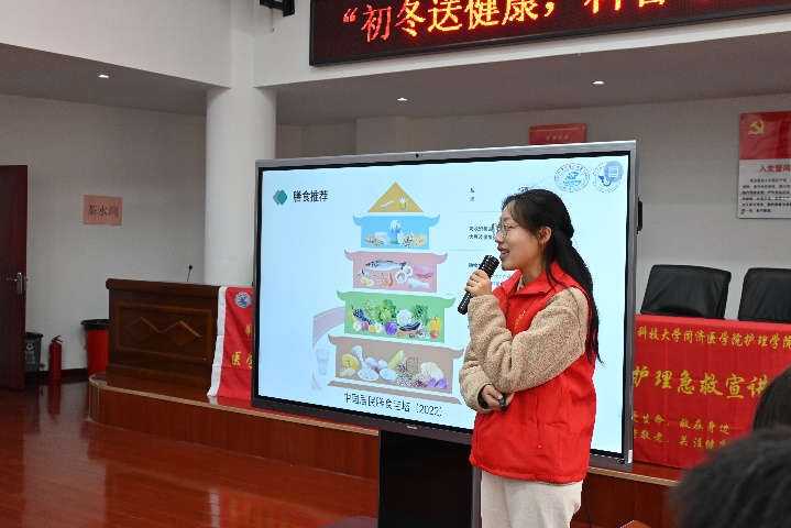在身心健康知识宣讲环节,团队成员张丽婷、王家雨、刘一凡分别就老年人最关心的膳食、慢性病、心理健康三方面展开科普,介绍了中国居民平衡膳食宝塔、慢性病预防与自我管理方法并提供了许多情绪调节方法,助力健康习惯与心态,力求以通俗易懂的方式传递科学知识与实用技巧。