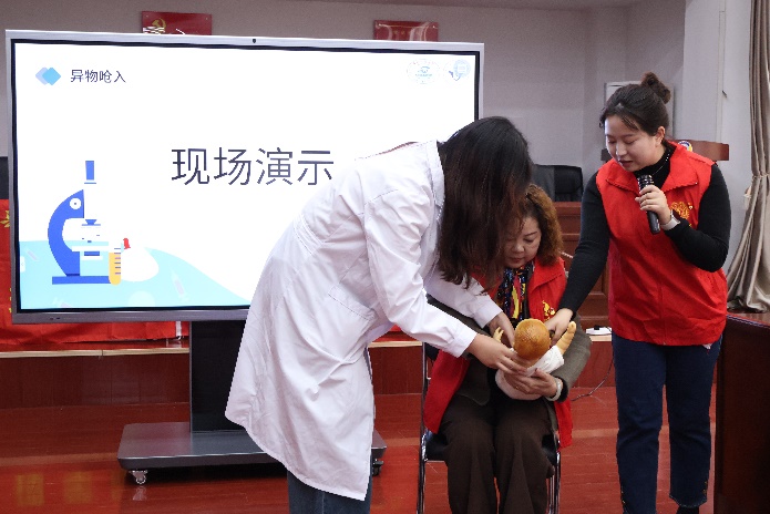 首先,在常用急救知识情景演示环节,团队成员朱荆琳、王俊鹏及班凤晓通过课程讲解及实景演示结合的形式,为在场老人开展心肺复苏及海姆立克法两种急救技能的科普分享。生动形象的科普让许多老年人从“围观凑热闹”到“主动积极参与”,他们眼中满含求知欲,并在培训后主动提问、举手参与模拟急救演练。