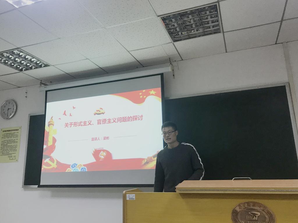 近日,中纪委办公厅印发了《关于贯彻落实习近平总书记指示精神集中整治形式主义、官僚主义的工作意见》,全面启动了集中整治形式主义、官僚主义工作,再次表明了党中央坚定不移全面从严治党、持之以恒正风肃纪的鲜明态度和坚定决心。12月21日,beat365英国官方网站研究生党支部邀请beat365英国官方网站哲学系梁彬同学讲授微党课,站在新的起点上对作风建设作出再动员、再部署、再深化的学习。