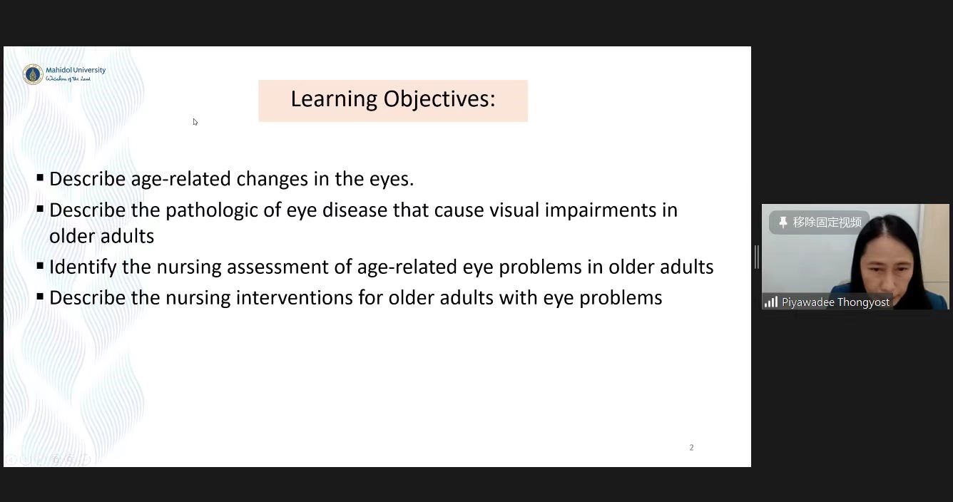 Piyawadee Thongyost讲师着重探讨“老年人眼耳疾病的护理评估与管理”,剖析了老年人常见听力与视力问题的护理诊断及干预措施。