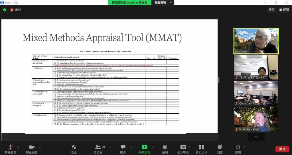 《循证实践》课程采用Anne Elizabeth Topping教授和Nutmeg Hallett副教授联合授课的方式,分设“数据库检索方法与实践”、“质量评价与偏倚风险”、“荟萃分析”等五大模块。两位专家循循善诱,借助Slido平台投票功能,应用“翻转课堂”教学模式,将学员分成若干小组,对研究问题进行评估与讨论。两位专家还进一步评价与演示相关研究文献,指导学员运用Ovid、Rayyan等多种搜索引擎与数据库检索文献,进行速览性综述训练。