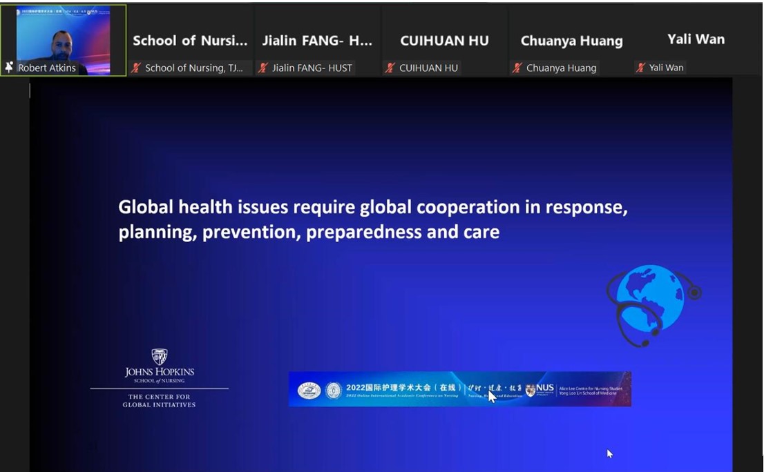 2022年,约翰斯·霍普金斯大学beat365英国官方网站执行副院长Robert Atkins教授在beat365英国官方网站主办的“2022国际护理学术大会(在线)”上作专题报告