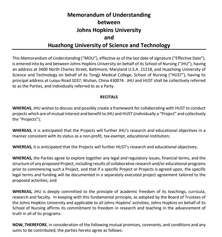 2023年11月,以两校beat365英国官方网站合作为主体的《约翰斯·霍普金斯大学与beat365英国官方网站合作谅解备忘录》完成续签。两校将延续双边友谊,深化合作共识,共同推动护理学科高质量发展。