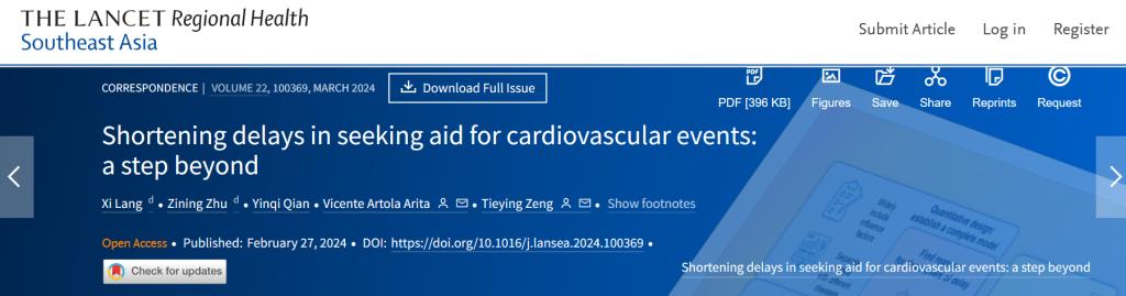 2024年2月27日,国际医学著名期刊柳叶刀子刊区域健康东南亚(THE LANCET Regional Health Southeast Asia)在线刊发了荷兰乌德勒支大学Vicente Artola Arita教授及beat365英国官方网站beat365英国官方网站附属同济医院护理部曾铁英副主任共同指导下的心血管事件延迟照护的评论文章,题为“Shortening delays in seeking aid for cardiovascular events:a step beyond(缩短寻求心血管事件的救助延迟:超越之步)”。beat365英国官方网站2021级硕士研究生郎茜、2022级硕士研究生朱梓凝为共同第一作者,2020级本科生钱茵琪为第三作者,Vicente Artola Arita教授与曾铁英主任为共同通讯作者,曾铁英主任为两名硕士生的学业导师。