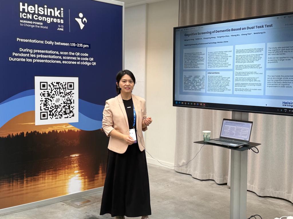 田翀副教授在大会作题为《睡眠时间延长是认知衰退的新预测因子》("Prolonged Sleep Duration as a Predictor of Cognitive Decline")的邀请报告。该研究揭示了睡眠变化轨迹与认知功能的关系,提出长睡眠(>9小时/天)与认知功能下降有关,睡眠时间延长是认知减退的稳定预测因子,这项颠覆传统睡眠健康认知的发现,为痴呆症防控提供了新证据。田翀副教授同时通过海报讨论的形式汇报了创新研究《基于双任务步态测试的痴呆症认知筛查》("Cognitive Screening of Dementia Based on Dual Task Gait Test"),其开发的步态-认知双重任务检测模型,可以实现不依赖专业人员的社区精准筛查,准确度超过90%,具备良好的基层医疗推广价值。这两项研究从生物标记物和实用技术双路径破解痴呆早期诊断难题,提供了重要的认知障碍护理实践新视角。