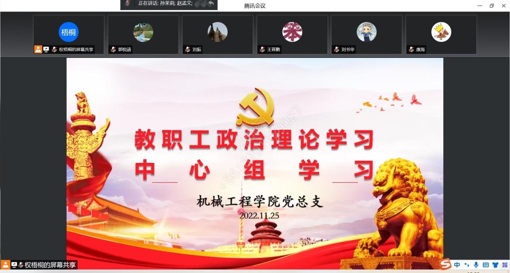 11月25日,beat365官方网站党总支召开11月中心组学习会议,会议采用线上方式进行。会议由孙茉莉书记主持。beat365官方网站党总支中心组成员参加会议。会议主要学习了《习近平总书记重要讲话精神:高举中国特色社会主义伟大旗帜为全面建设》《习近平在瞻仰延安革命纪念地时强调弘扬伟大建党精神和延安精神为实现党的二十大提出的目标任务而团结奋斗》《习近平给中国航空工业集团沈飞“罗阳青年突击队”队员们的回信》《中共中央政治局常务委员会召开会议 听取新冠肺炎疫情防控工作汇报 研究部署进一步优化防控工作的二十条措施》;学习了“双重组织生活”等学习文件:《关于进一步规范和落实党员领导干部“双重组织生活”制度的通知》、《关于校院两级党员领导干部落实党支部工作联系点制度的通知》《关于加强和改进高校党支部建设的意见》《中共陕西省委组织部关于建立党委(党组)书记党支部工作联系点制度的通知》《关于进一步加强党支部标准规范化建设的指导意见》。交流学习环节,李逸仙、李玲同志,主要以二十大学习为主题进行了心得分享。王永锋院长以“深入学习贯彻党的二十大精神,推进学校十四五发展规划落地见效”为题,做了我院十四五工作规划总结分享学习。
