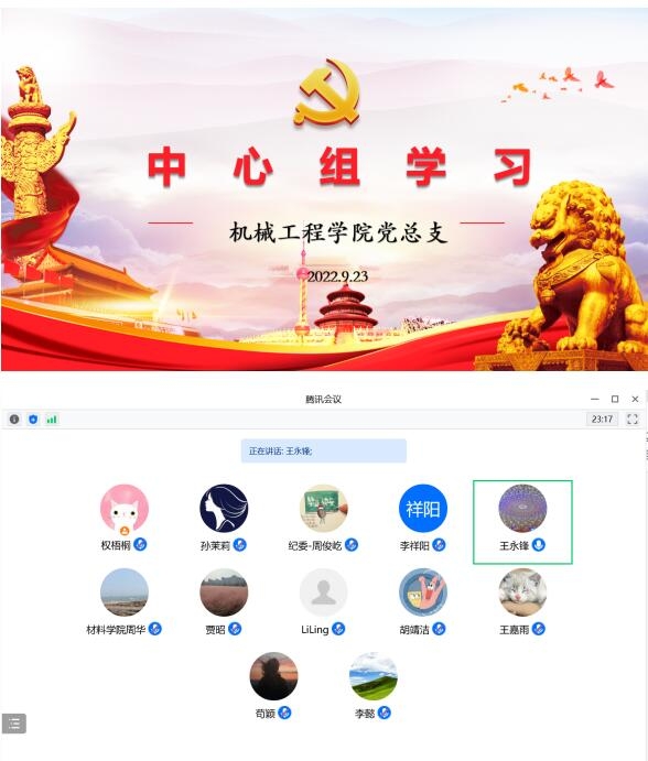 10月30日,根据学校党委具体要求,中心组开展了二十大专题学习。孙茉莉书记带领全院和中心组完整全文学习了二十大报告全文;王永锋院长带领学习了二十大报告中的新表述新概括新论断;其他成员分别领学了新旧党章的区别、二十大报告中关于教育的论述-杨武成;、二十大一中全会公报学习、中央政治局常委介绍。交流学习环节,孙茉莉、谢肖同志,主要以从严治党:四个始终、五个牢牢把握为主题进行了分享学习。