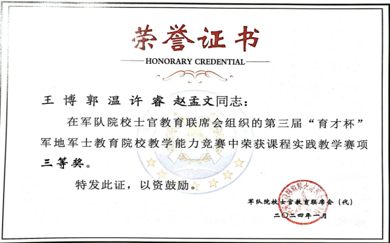 近日,由军队院校士官教育联席会(代)主办的第三届“育才杯”军地军士教育院校教学能力竞赛结果公布,beat365由beat365官方网站王博、郭温老师负责,许睿、赵孟文老师参加的《机电液一体化综合实训》实践课程荣获三等奖。