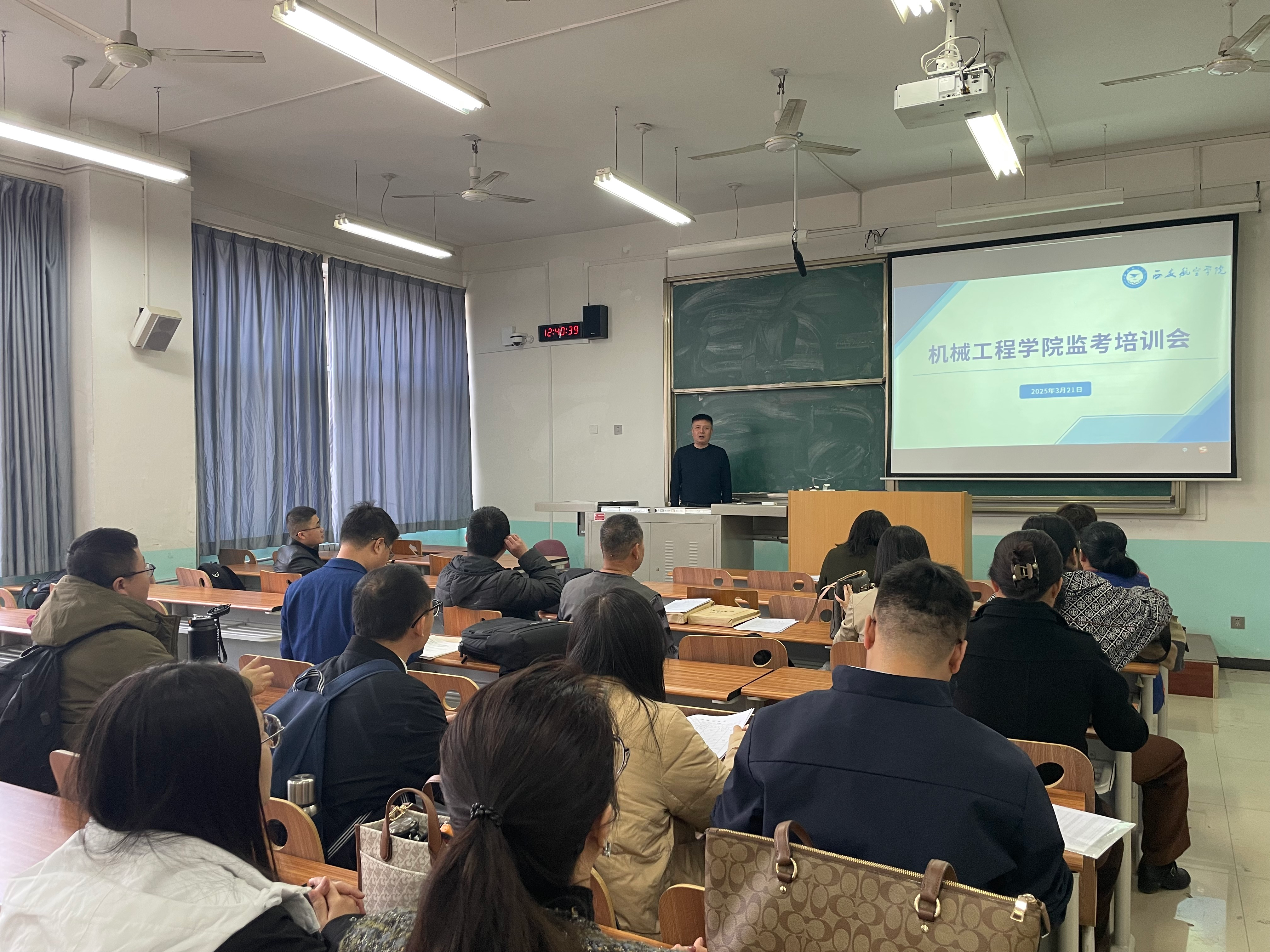 教学副院长李懿结合学校《beat365官方网站课程考核管理办法》、《beat365官方网站监考巡考补充办法》等文件,重点培训考场标准化管理流程,要求考前严格执行考场清理程序,运用金属探测仪对电子设备进行二次筛查;考中规范执行试卷启封、身份核验、考场巡查等多项标准化操作;考后完善违纪行为“认定—取证—处置—归档”闭环管理体系。