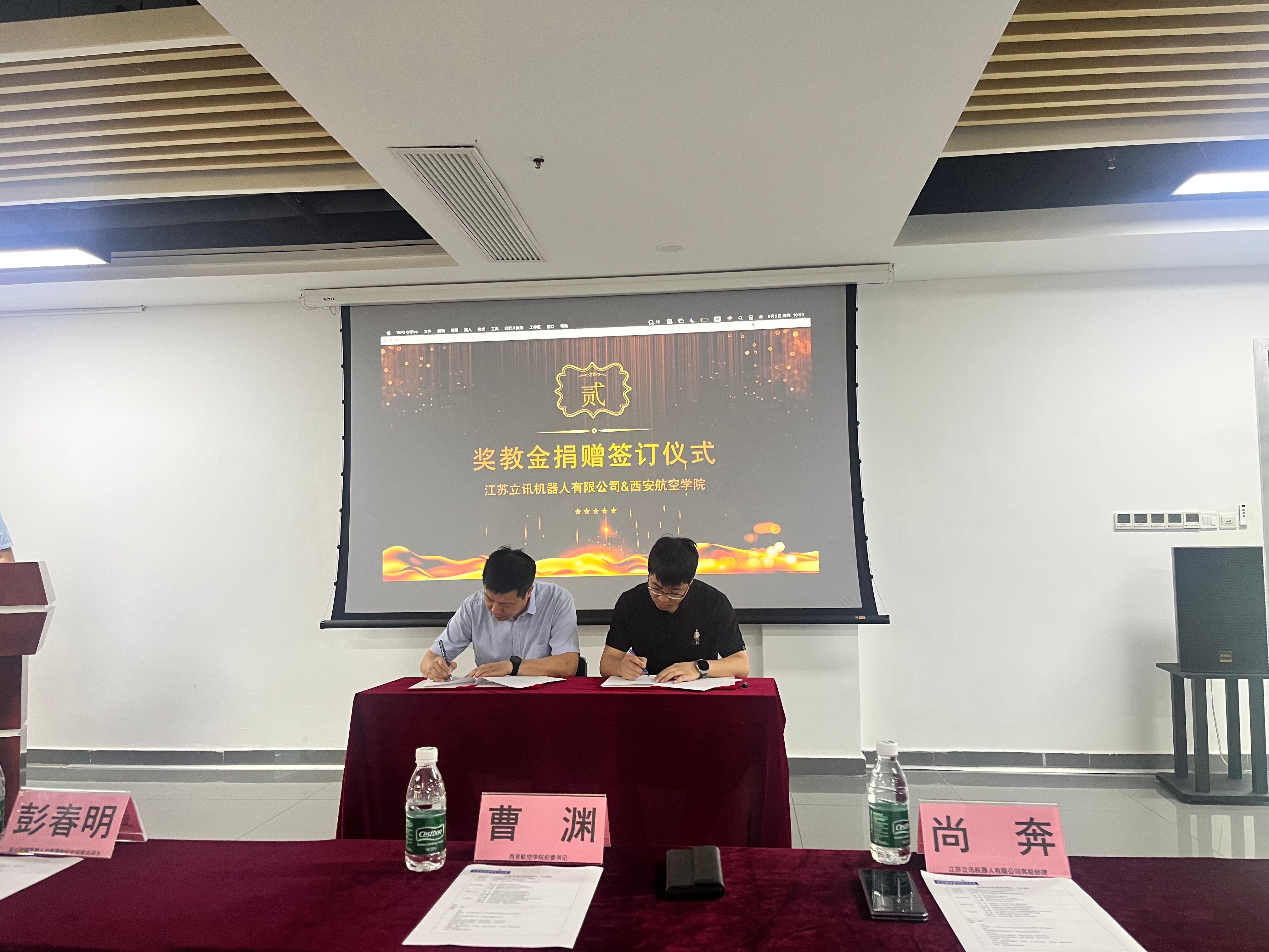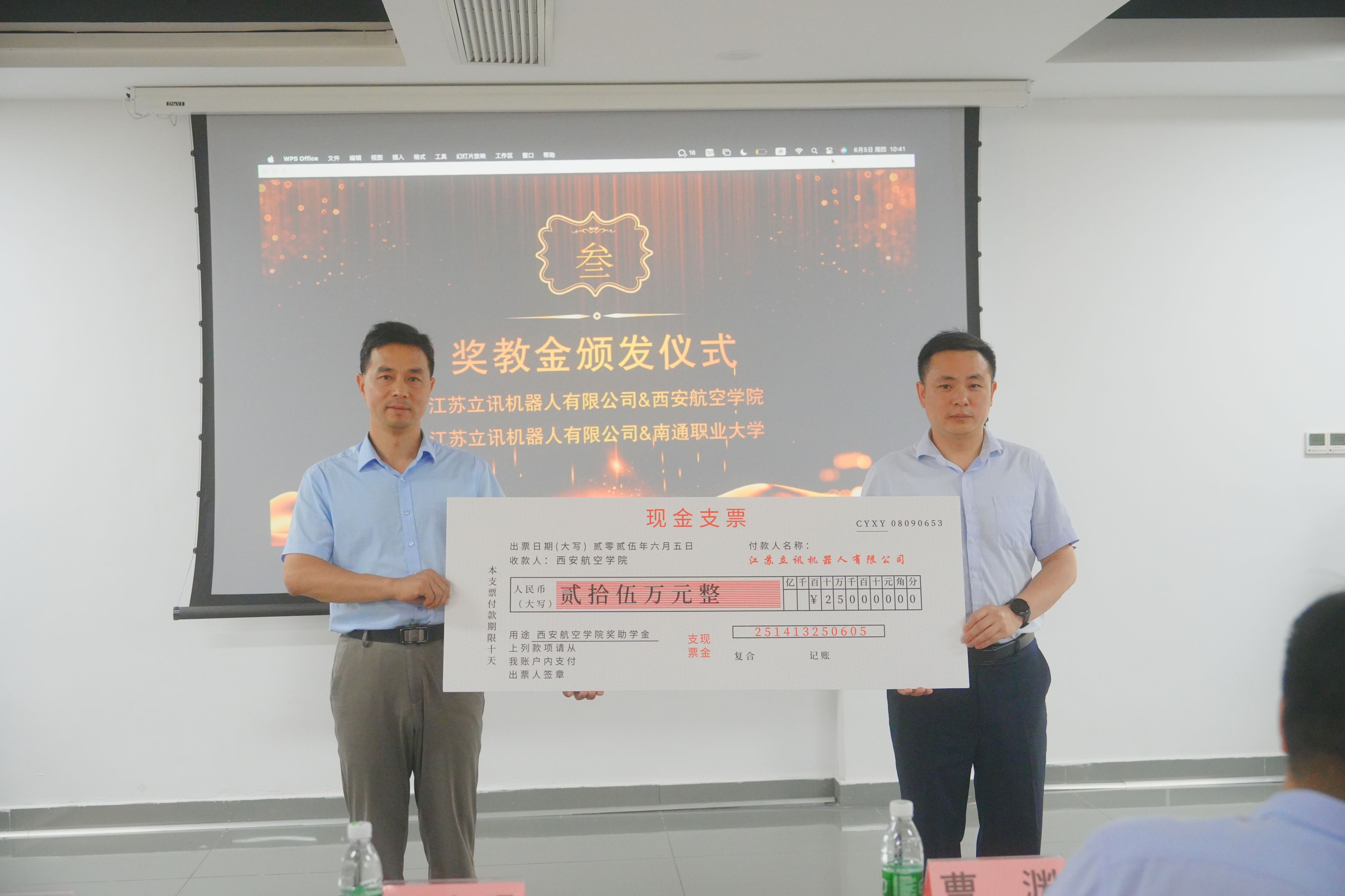 在喜迎建校70周年之际,6月5日,学校纪委书记曹渊、beat365官方网站院长王永锋等一行赴江苏立讯机器人有限公司,出席“江苏立讯机器人奖教学金”捐赠及颁奖典礼,并深入进行校企合作调研。昆山市锦溪镇人社局局长彭春明、立讯机器人公司高级经理尚奔等企业领导出席活动。