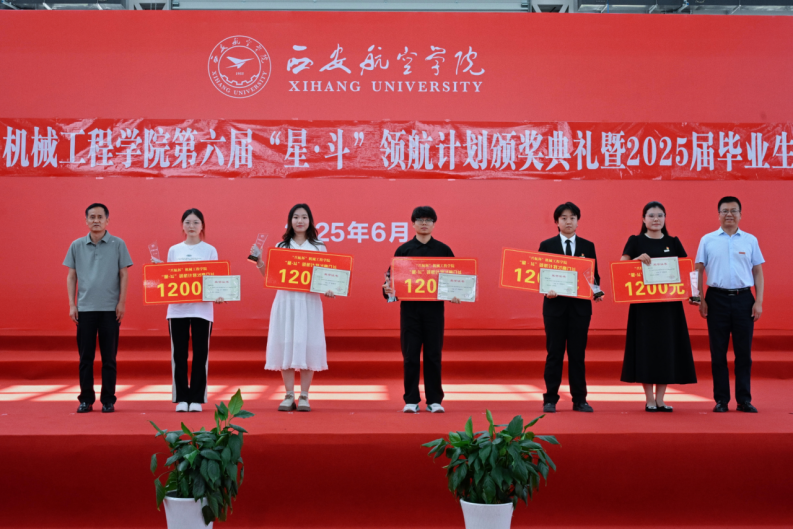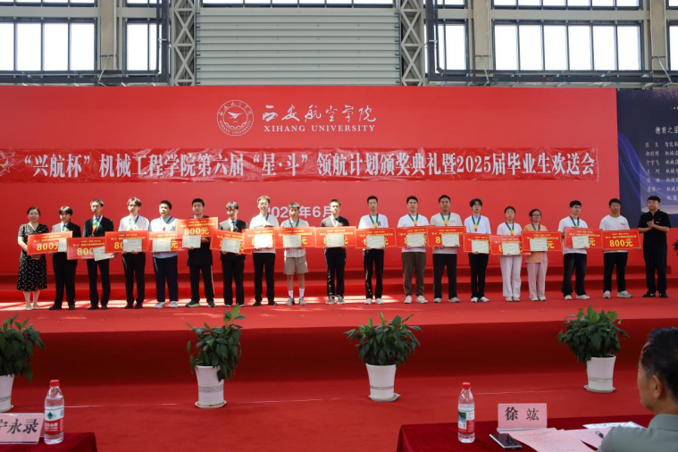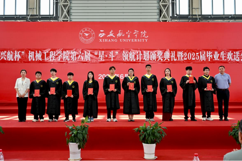 6月23日下午,beat365官方网站第六届“兴航杯”星•斗领航计划颁奖典礼暨2025届毕业生欢送会在阎良校区民航实验实训基地举行。西安兴航航空科技股份有限公司总经理徐竑、人事经理丁楠,校党委副书记宁永录,组织部申良、学生工作处李波、图书馆刘文哲、教务处刘宁、校办工厂郝大鹏、体育部薛红强等部门负责人,以及beat365官方网站全体干部、师生代表共同出席典礼,见证荣耀时刻,共叙师生情谊。