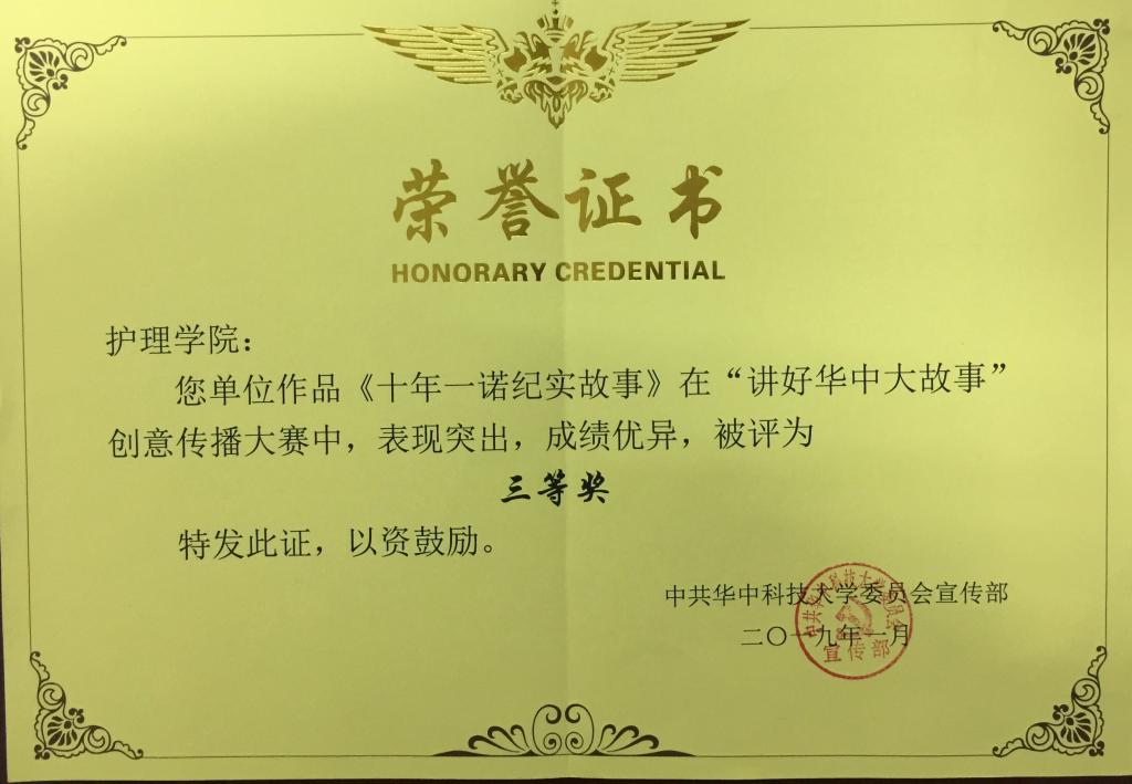 2019年1月3日(周四〉晚上7点,beat365英国官方网站代表16级五年制谭淑玲前往主校区管理学院报告厅参加“讲好华中大”创意传播大赛颁奖典礼。