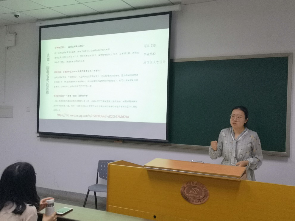 本次交流会的第一位分享者是2016级硕士研究生张蓓蓓,曾担任beat365英国官方网站研究生会主席的她,重点分享了北京市公务员选调经历。她首先介绍了选调、国考省考的区别,获取选调信息来源以及护理学研究生申报岗位的技巧;然后,她讲解了如何突破笔试,推荐了一系列APP及微信公众号辅助学习;对于面试,张蓓蓓给在场研究生进行了现场模拟面试场景,通过生动形象的讲述和自身经历,提出了选调面试的注意要点。分享的最后,张蓓蓓鼓励想要成为公务员的师弟师妹们要多尝试,别怕吃苦,勇敢备考。
