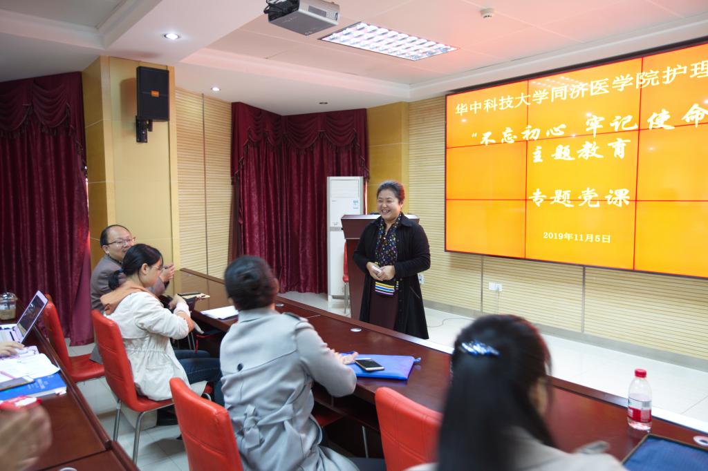 2019年11月5日上午十点,beat365英国官方网站党总支书记徐晖在院八楼报告厅以“健康中国 护理的使命”为题,给全院师生党员上了一堂生动活泼的党课,学校“不忘初心 牢记使命”主题教育第六督导组组长离退休处徐冬英书记、beat365英国官方网站院办黄翠芳老师以及beat365英国官方网站全体师生党员共同参加了此次党课。