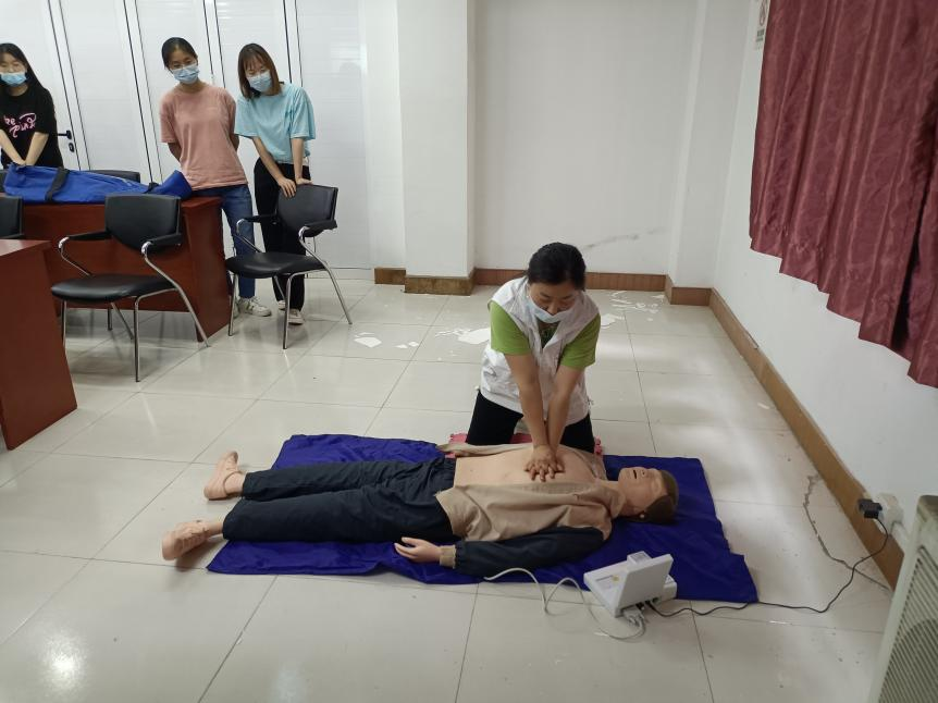 培训的第二项是梁霞老师进行动作示范和讲解。梁霞老师动作标准,操作流程完整,包括确认周边环境安全、做好个人防护,判断病人是否有意识,向周围人寻求帮助,判断是否有呼吸,胸外按压,人工呼吸等一系列动作。