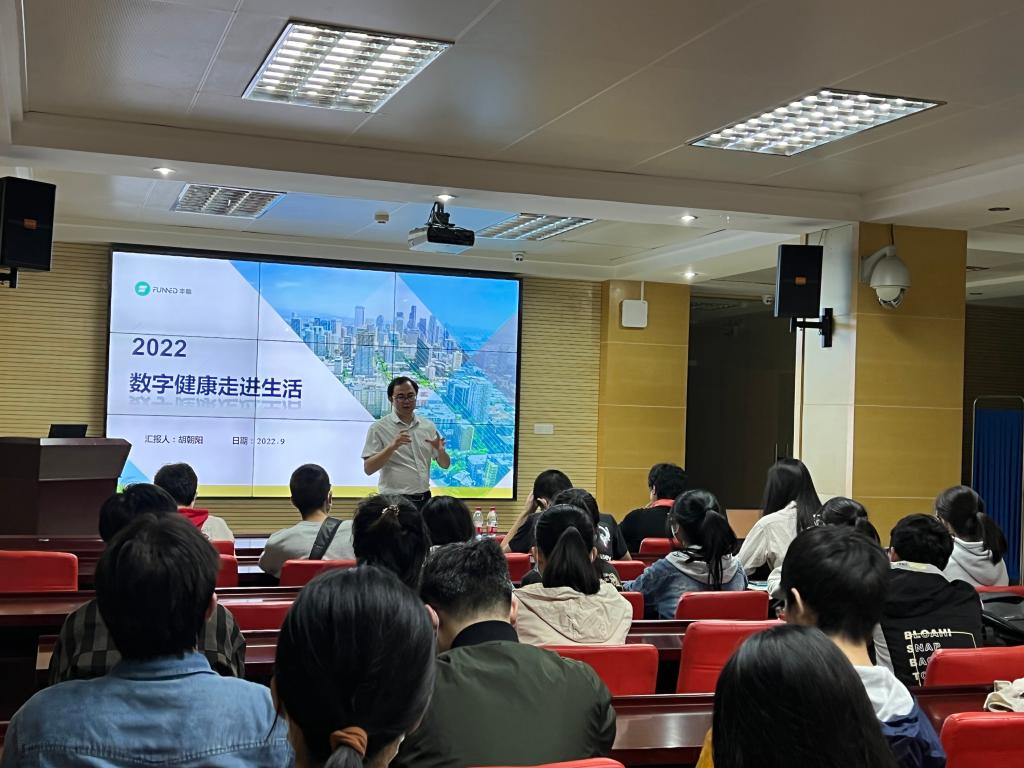 首先,胡朝阳校友向同学们分享了自己一路的求学创业历程,勉励同学们要保持乐观向上的积极心态,始终对一切事物保持好奇心,做生活中的强者。其次,他介绍了其所在的丰能数字健康研究院,向同学们详细介绍了数字健康的概念和背景以及数字实验室,使同学们对数字健康这一领域有了更深层面的理解。