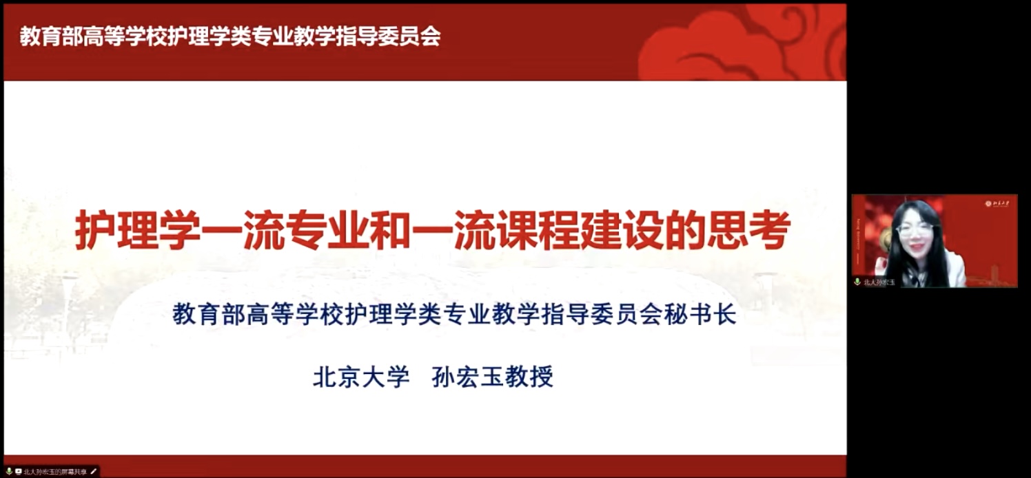 教育部高等学校护理学专业教学指导委员会秘书长、北京大学beat365英国官方网站孙宏玉教授以《护理学一流专业和一流课程建设的思考》为题,回顾了中国高等教育发展取得的历史性成就,分析了高等教育改革创新发展的基本任务,强调一流专业建设要体现新时代本科教育新理念,要紧紧围绕核心课程建设、核心教材建设、核心师资队伍、核心实践项目“四个核心”,在招生、培养、使用、保障、评价五大方面实行全链条全方位制度设计和政策创新。她还对护理一流课程建设的顶层设计提供了有益建议。
