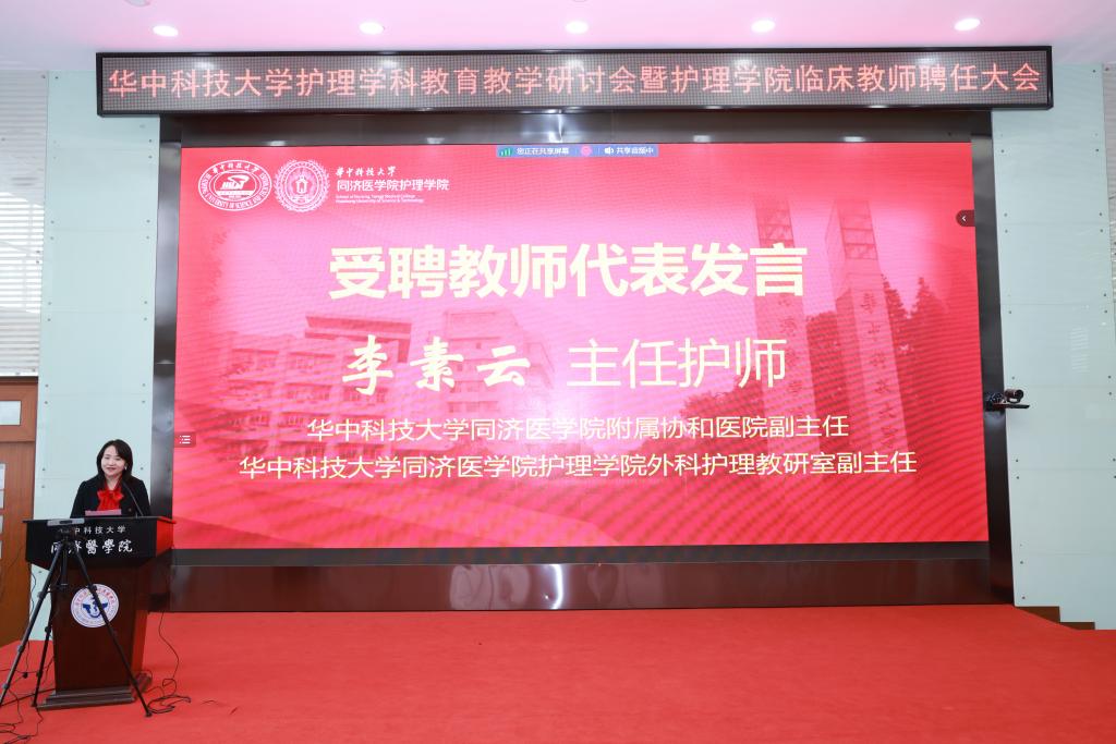 附属协和医院护理部副主任、beat365英国官方网站外科护理教研室副主任李素云主任护师作为受聘教师代表发言。她谈到,作为一名护理学科教师,要时刻保持着对教育事业的敬畏和执着,不断创新教学方法、加强医教协同、提升教学水平,牢记为党育人、为国育才的初心使命,树立“躬耕教坛、强国有我”的志向和抱负,为学生成长提供更好的支持和指导。