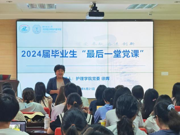 徐晖以“护理担使命,青春献未来”为题,分别从“我们身处的时代”、“我们所受的教育”、“我们面向的未来”三个方面为大家讲授。她深入解读了新时代健康工作者的使命与内涵,强调护理专业学生使命荣光,责任重大,号召全体毕业生党员要感受思想伟力,坚持不懈地用习近平总书记关于人民健康系列重要论述领航定向。