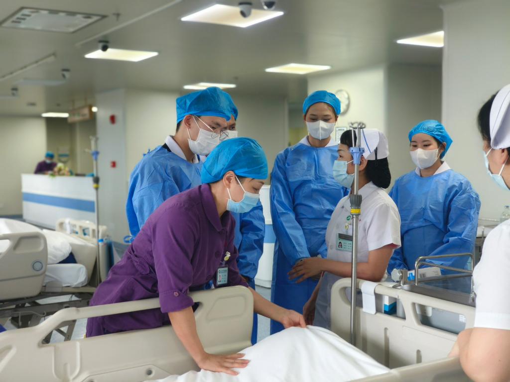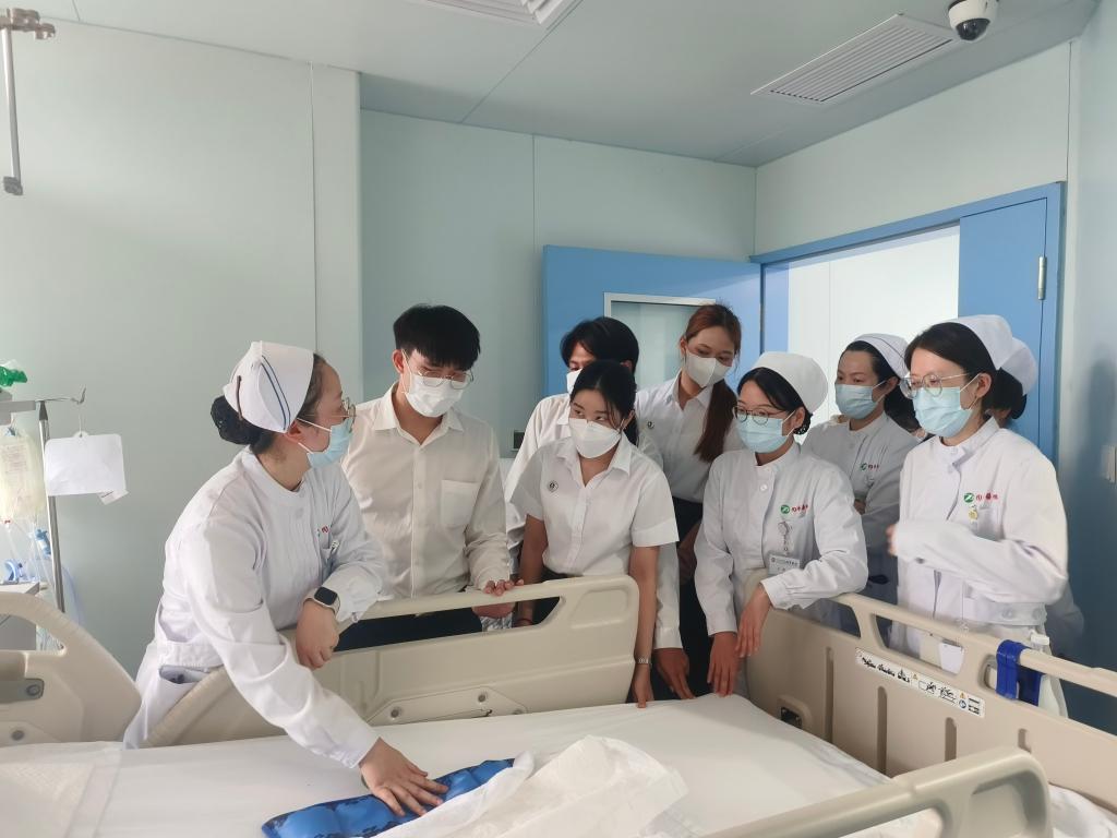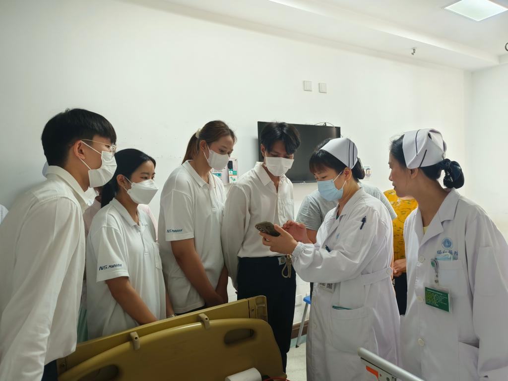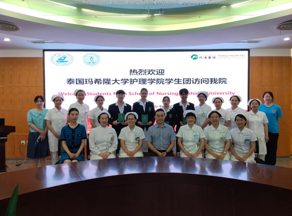 7月8日至7月9日下午,玛希隆大学beat365英国官方网站学生代表团赴beat365英国官方网站beat365英国官方网站附属同济医院参观学习。附属同济医院护理部专科护士长席新学对学生代表团的到访表示热烈欢迎,他介绍了医院的历史沿革、护理学科发展及临床实践的工作特色与亮点,并代表医院护理部向学生代表团赠送同济医院文化纪念木雕。附属同济医院总护士长周雁荣、何细飞,护士长李小攀、吴明珑、汤曼力、刘娟、张梦、刘清华、程捷,教学老总金晓璐、肖琦等参加欢迎仪式及交流活动。