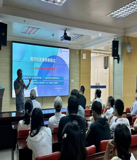 讲座中,胡朝阳围绕“数字社区素养新模式”这一主题,首先展示了中国进入新时代的一些改变,接着过渡到数字健康,深入浅出地讲解了如何实现数字健康以及数字健康中遇到的的一些问题,并使用恰当的比喻使原本枯燥的理论变得生动有趣,极大地激发了听众的兴趣。同时,胡朝阳分享了自己的一些亲身经历和心得体会,他提到自己在实习后发现对护理工作不感兴趣,便投身商业,但也遇到了一些困难,刚开始资金不足,后面又要观察市场需要等,凭着一股劲做到了现在的成就。他指出护理专业就业方向广,不一定就是进入医院做护士,可以根据自己的兴趣来选择职业方向如科研、商业、宠物护理师等,并鼓励大家勇于探索、敢于创新,还祝愿每一个人成为科学家,让每一份研究发挥价值。