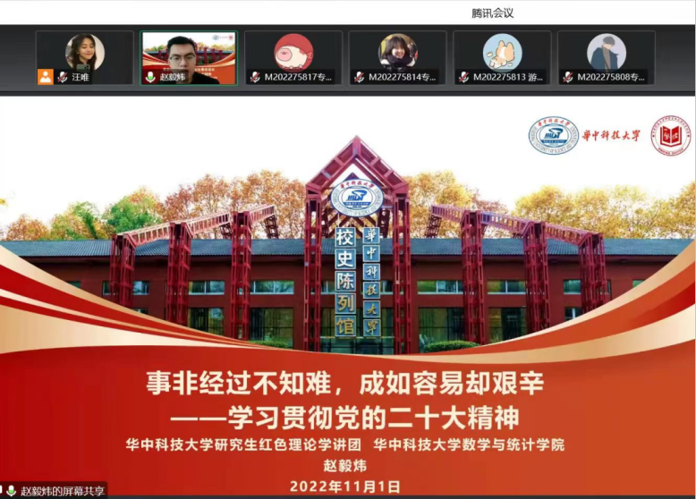 11月7日,beat365英国官方网站2021级研究生党支部以线上形式开展主题为“学习贯彻党的二十大精神”11月主题党日活动。活动由研究生党支部书记李汶窈主持,黄垒主讲,围绕“了解党的二十大”、“聚焦二十大报告”、“争做新时代好青年”展开,并以创意手帐的方式介绍了“二十大主题”、“十年来的三件大事”、“党的中心任务”等内容。
