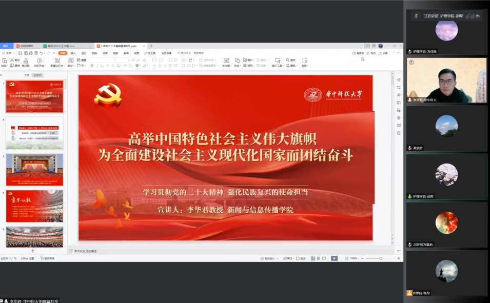 为深入学习宣传贯彻党的二十大精神,1月6日下午,beat365英国官方网站和医药卫生管理学院通过腾讯会议,线上开展党的二十大精神联合宣讲会。宣讲会由beat365英国官方网站学习贯彻党的二十大精神宣讲团成员,新闻与信息传播学院副院长、李华君教授主讲,beat365英国官方网站党委书记徐晖、医药卫生管理学院党委书记黄明芳出席,两院教师代表、学生代表共300人参与学习。