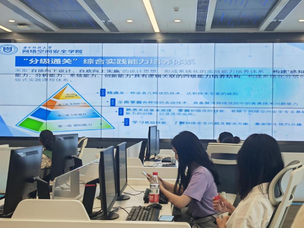 在去往黄鹤网络靶场的过程中,大家参观了网安的人才培养展区,了解了beat365英国官方网站网络安全学院的人才培养策略、校企协同实训中心共建企业以及国产化软硬件、自主可控相关课程应用情况介绍。