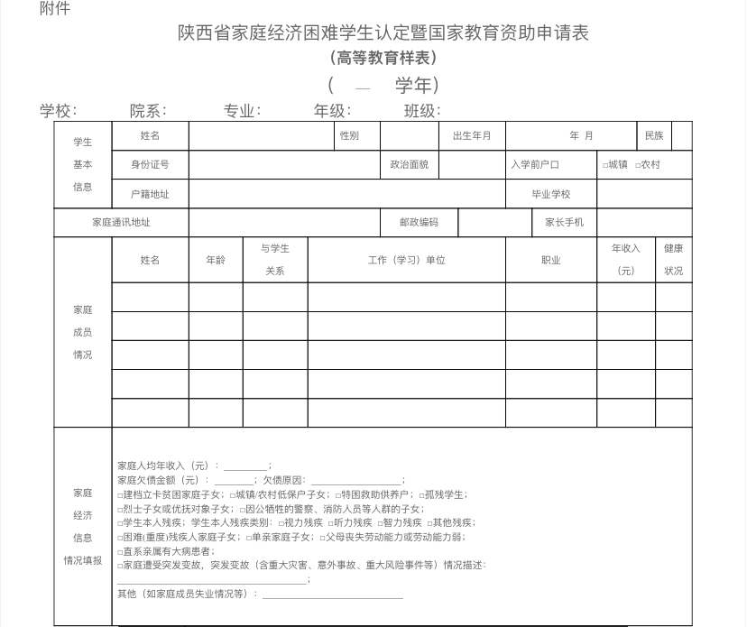 附件:陕西省家庭经济困难学生认定暨国家教育资助申请表